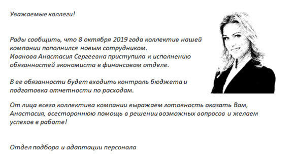 Если компания очень большая или офисы находятся в разных городах, есть другой способ познакомить с коллективом через корпоративную рассылку. Разошлите письмо-представление нового сотрудника с фотографией, краткой информацией и пожеланием удачи на новом месте. При этом указывать образование, хобби и предыдущее место работы, на мой взгляд, неэтично, если человек захочет сам все расскажет.