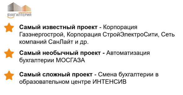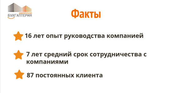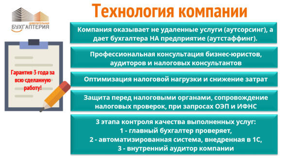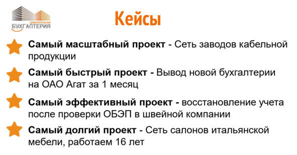 У нас используется такая уникальная система ведения учета, как инновационная бухгалтерия. Мы приходим, анализируем и перестраиваем бухгалтерию этой фабрики, завода или всего холдинга наших клиентов, чтоб она стала эффективной, экономичной и приносила прибыль владельцу, а он был спокоен за учет, не переживал за то, что в ней происходит.