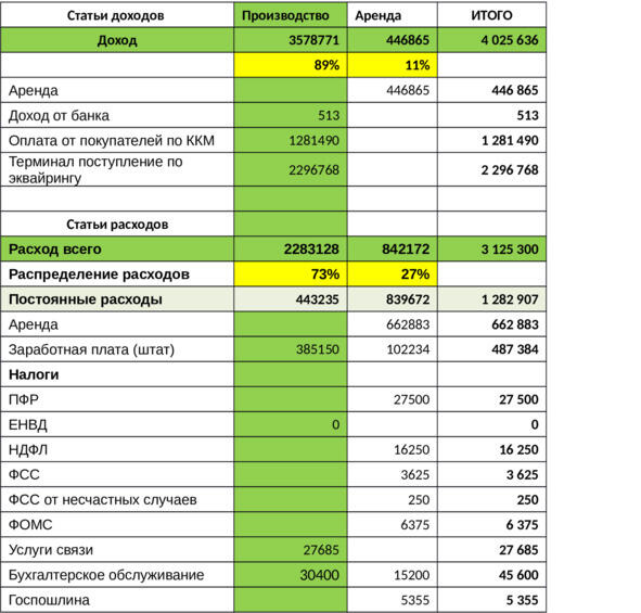 Цифры и названия изменены, информация конфиденциальна. У предприятия 2 направления бизнеса (аренда и производство). 2 юридических лица по ним разделяются финансовые потоки для контроля бизнеса.