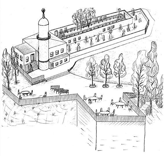 Рис. 2. Комплекс сооружений на вершине горы Бейкос у Босфора, недалеко от Стамбула. Храм, минарет, а справа огороженное решеткой и двойной стеной пространство, называемое «могилой святого» Иисуса (Юши). По краям «могилы» лежат два круглых камня, напоминающих жерновы. К одному из них привязан шест (изображающий копье?). План составлен Т. Н. Фоменко во время посещения горы Бейкос в октябре 1995 года.