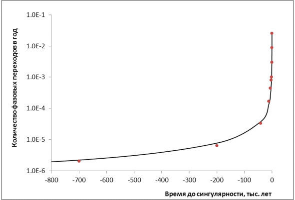 Эти расчёты показали сокращение периодов между фазовыми переходами в истории биосферы и антропосферы, которые в этом веке тяготеют к вертикальному скачку из состояния гиперболической кривой всего предыдущего периода.