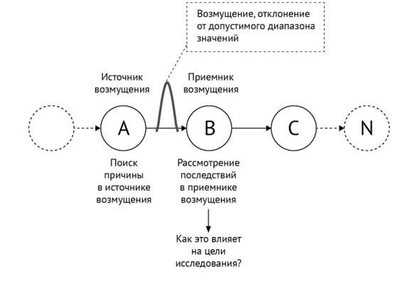 Каждый элемент системы рассматривается дважды: и как приемник возмущения от предыдущего элемента (-ов), и как его источник для следующего элемента (-ов).