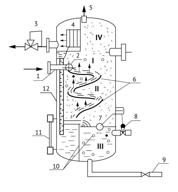 I основная сепарационная секция; II осадительная секция; III секция сбора нефти; IV секция каплеудаления; 1 патрубок ввода газожидкой смеси; 2 раздаточный коллектор со щелевым выходом; 3 регулятор давления «до себя» на линии отвода; 4 жалюзный каплеуловитель; 5 предохранительный клапан; 6 наклонные полки; 7 поплавок; 8 регулятор уровня и линии отвода нефти; 9 линия сбора шлама; 10 перегородки; 11 уровнемерное стекло; 12 дренажная труба.