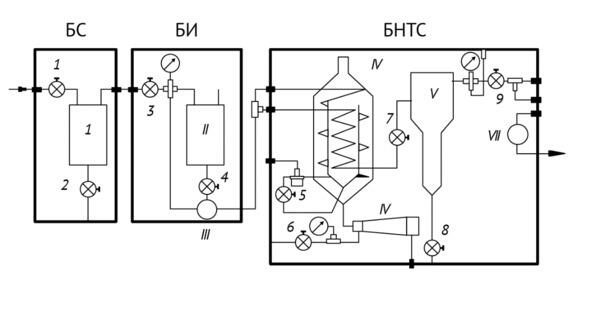 БС блок первичной сепарации, БИ блок ингибирования, БНТС блок низкотемпературной сепарации
