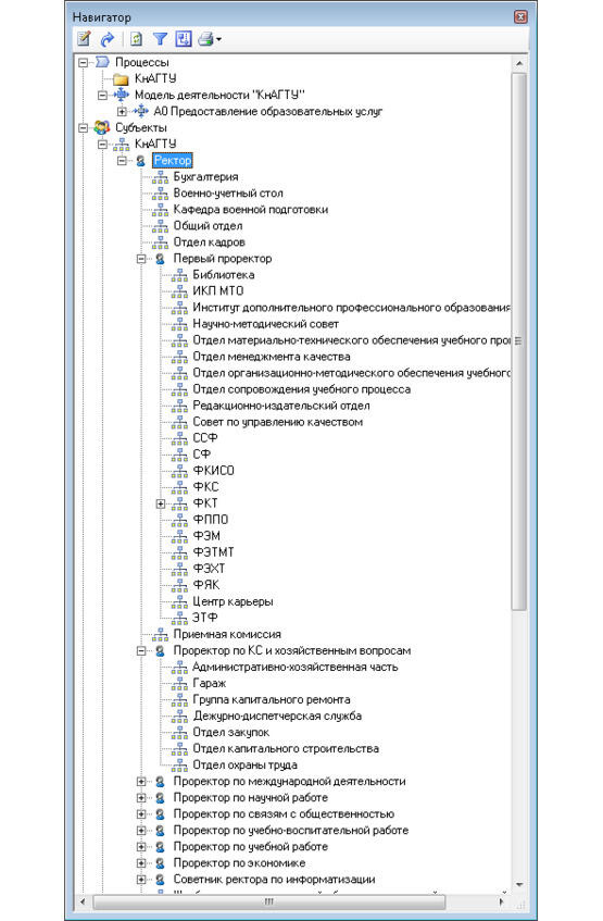 В Business Studio описана организационная структура университета (рисунок 2), а также выделены плоскости BSC-карты: клиенты, обучение и развитие, финансы, внутренние бизнес-процессы. Было проведено распределение целей по плоскостям стратегической карты, что отображено на рисунке 3.