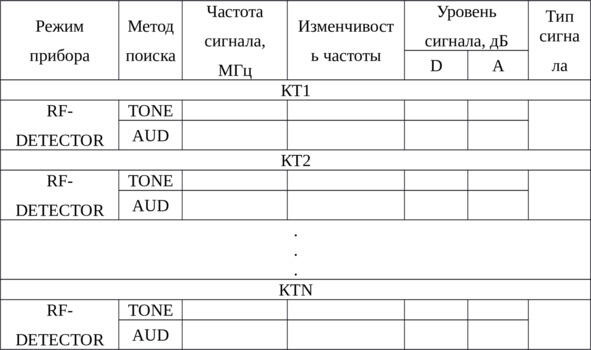 Провести обследование помещения в режиме высокочастотного детектора-частотомера не менее чем в 5 контрольных точках (КТ) с использованием телескопической и высокочастотной антенн. При обнаружении посторонних сигналов провести их идентификацию и определить характеристики. По возможности установить источник этих излучений и его примерное местоположение. По результатам исследований заполнить таблицу 1. В столбце «Изменчивость частоты» возможно одно из двух значений высокая, низкая.