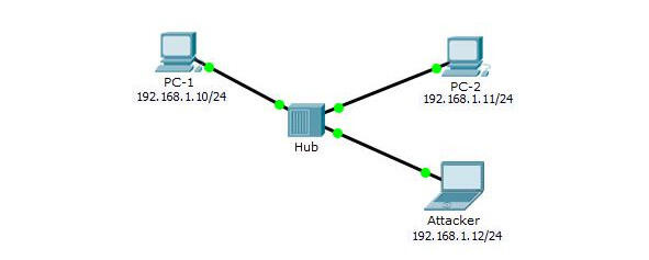 Для проверки уязвимости соберем лабораторный стенд по топологии, представленный на рисунке 1. На атакующем компьютере был установлен сниффер Wireshark, позволяющий перехватывать сетевой трафик для дальнейшего анализа.
