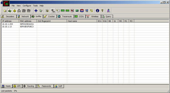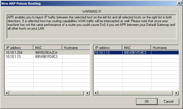 Перейдем во вкладку Sniffer. Нажмем кнопку «Add to list» (изображение плюса) и укажем диапазон нужных IP-адресов, которые находятся в сети. После этого в списке будут видны IPv4-адрес маршрутизатора (10.10.1.254) и IPv4-адрес жертвы (10.10.1.13). Это показано на рисунке 42.