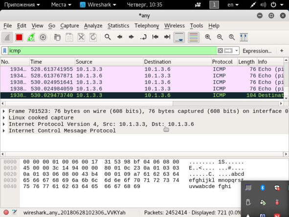 В нашем случае IPv4-адрес атакующего имел вид 10.10.1.1, IPv4-адреса жертв: 10.10.1.3 и 10.10.1.6 соответственно. После произведенного MAC-флудинга атакующий компьютер с помощью Wireshark смог перехватить пакеты, предназначенные для других узлов (рисунок 39).