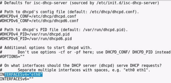 Перейдем по адресу: /etc/default/isc-dhcp-server. В строке «#INTERFACESv4=«"» уберем «#» и в скобках впишем eth0. Конечный результат будет выглядеть как на рисунке 50.