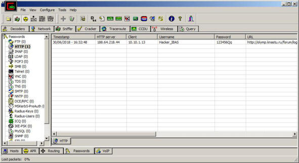 На компьютере жертвы откроем сайт, работающем на протоколе HTTP, например, http://olymp.knastu.ru. Вводим любой логин/пароль (рисунок 44). Атакующий получает логин/пароль от жертвы (рисунок 45).