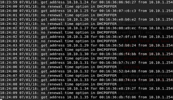 На атакующем компьютере с помощью виртуальной машины был развернут дистрибутив GNU/Linux «Kali Linux». Атаку будем выполнять при помощи утилиты «dhcpstarv». Прежде эту программу необходимо установить при помощи команды в терминале apt-get install dhcpstarv. Для запуска утилиты, необходимо ввести команду dhcpstarv i eth0 (где eth0 порт для выхода в сеть, его узнать можно с помощью команды ifconfig). Данная программа записывает на себя все доступные адреса, поставляемые DHCP сервером. Как результат сервер не может выполнять свою функцию. На рисунке 47 показана работа программы, а на рисунке 48 продемонстрировано, как заполняются все доступные IPv4-адреса в DHCP-сервере.