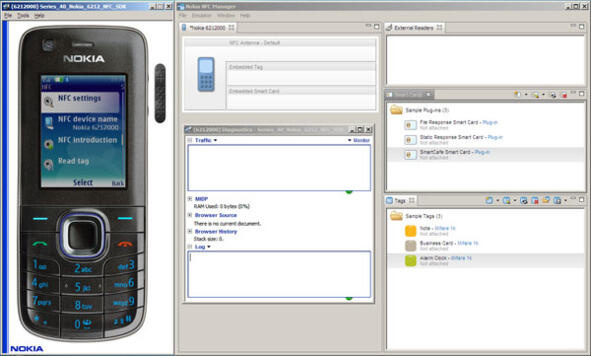 Этот SDK не только поддерживает JSR 257 API, но и позволяет симулировать наличие либо отсутствие виртуальной смарт карты. SDK также поддерживает OMNIKEY и PEGODA карт-ридеры, которые подключены к Вашему настольному компьютеры, что позволяет быстро создавать и тестировать приложения на реальных NFC картах. Скриншот S40 Nokia 6212 NFC SDK показан выше.
