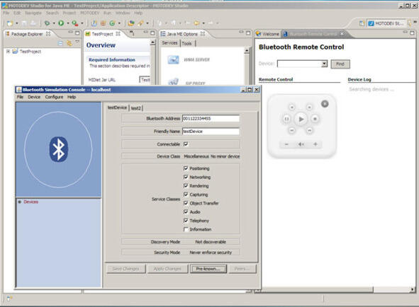 Эти сервисы позволяют Вам симулировать реальные события без необходимости отладки на реальном устройстве. Например, Bluetooth Service содержит Rococo Bluetooth симулятор, который позволяет симулировать Bluetooth устройства в MOTODEV Studio.