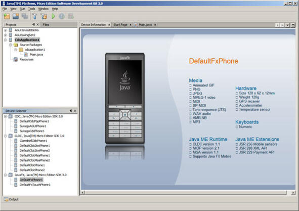 Java ME SDK одна из нескольких доступных SDK ориентированных на некое гипотетические устройство, что дает возможность разрабатывать и отлаживать мобильные приложения перед «заточкой» их под конкретную мобильную платформу. SDK содержит Platform Manager, который позволяет эмулировать конкретную платформу. На рисунке 1.9 показан Java ME SDK 3.0 с запущенным эмулятором JavaFX телефона.