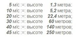 Поскольку, для высот до 250 метров спортсмен не развивает равновесной скорости падения, определение значения скорости свободного падения происходит методом математического моделирования. На высотах от 15 до 300 метров она в диапазоне от 12 м/с до 50 м/с. Ниже данные моделирования для прыгуна массой 100 кг, показывающие достижение скорости свободного падения после пролёта определённой высоты: