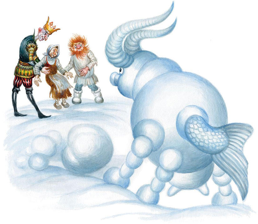 И вот уже около избушки на курьих ножках стоит непонятное чудище. С рогами, лысое, как Кощей, с рыбьим хвостом, как у Водяного, и с громадным выменем.
