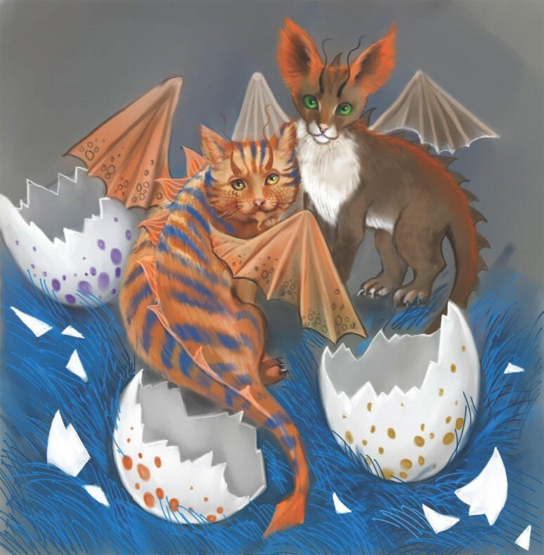 Уставшие мама и папа Котодроки уснули, укутавшись всем семейством в синее пуховое облако из папиной шерсти. Утром Корнелиус открыл глаза, в пещеру светил лучик света, слышно было пение птиц. Папа вышел из пещеры, посмотрел на свой синий голый живот и хвост, расправил крылья и полетел, ему нужно было исполнить задание предупредить короля Симона.