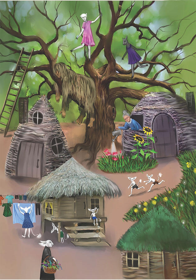 Друзья стали жить вместе в домике Кузяки. Его лесное жилище было из веток, как шалаш, сверху засыпано мхом, в нём было тепло и безопасно, рядом стояли ещё домики и жили много милых и добрых соседей. Сумрик познакомился с Брукой и Хрукой, они были сестрички с вытянутыми мордочками и длинными ножками с маленькими копытцами, они скачут и смеются, жуя цветочки и листочки. Сестрички жили с родителями, которые приглядывали за ними. На большом дереве живёт Скрук, он спит, свесив лапы, на ветвях дерева. Скрук добрый, большой и лохматый, из-за шерсти не видно даже глаз. В домике с соломенной крышей живёт семейство Слюшей, они с маленькими мордочками и большими торчащими ушами.