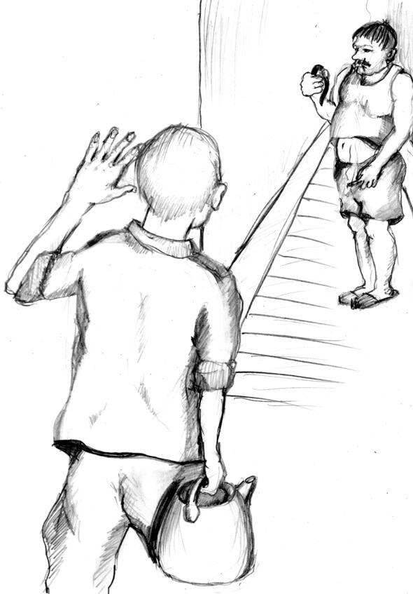 На всё! счастливый, что всё срослось, я взял увесистый, бумажный пакет с добычей и выскользнул в коридор. И тут же наткнулся на него щербатого, ухмыляющегося рыжего монстра из горы мышц и сверлящих глаз. От взгляда, напоминающего Сталина, мне сразу стало жутко. Прижав пряники к сердцу, обеими руками, я замер, жадно сделав последний вдох, как перед смертью. Сердце нырнуло в глубину сапога и затихло.