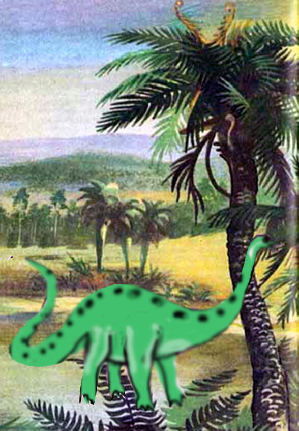 Тине это было приятно. А диплодок Дима подумал: «А я что могу сделать для своих друзей?» И придумал: стал вытягивать шею совсем высоко, хватать зубами совсем высокие ветки и тоже притягивать их вниз и держать зубами. Только он не мог выговорить: «Ребята, угощайтесь!», потому что у него рот был занят ветками. У него получилось пробормотать только: «Бебяда, убобайбедь!», но Тина и Петя всё поняли, съели листья, плоды и ягоды и сказали вместе: