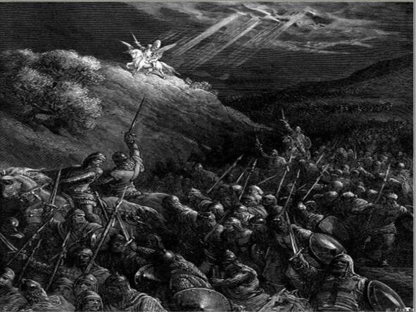 Архангел Михаил в «час Х» поведет в бой воинство Христа против Диавола. А на гравюре Г. Доре помогает крестоносцам под Антиохией