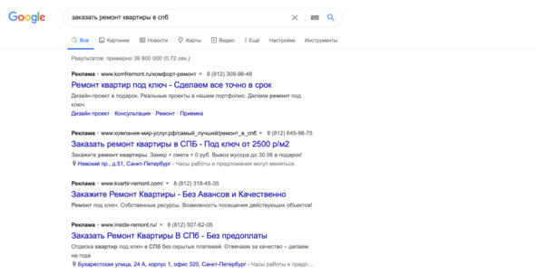 по ключевым словам («ремонт квартир Москва», «салон красоты Краснодар»)