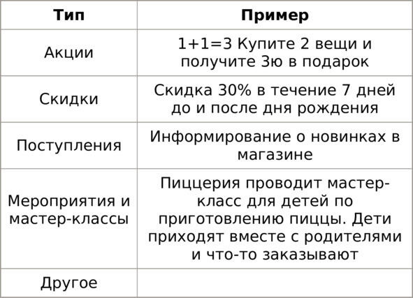 Здесь вам нужно записать все поводы, которые вы сможете использовать в будущем на этапах продвижения. На основе анализа конкурентов, который вы уже сделали, улучшите те, которые уже у вас есть или которые вы видели у конкурентов.