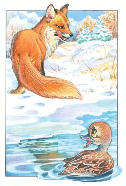 Лёд был крепкий, и Лиса садилась на самом краю. Бедная Серая Шейка со страху ныряла в воду, а Лиса сидела и зло посмеивалась над ней: