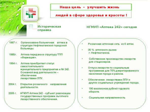 Наше предприятие организовано более сорока лет назад. За это время мы претерпели несколько реорганизаций, прожили несколько жизненных циклов В любом случае, мы работаем эффективно. На сегодняшний день, в нашей сети шесть аптек. Мы занимаем примерно 35% рынка города Нефтеюганска. Занимаемся выполнением социальных программ и обеспечиваем учебно-профилактические учреждения. Наша особенность в том, что мы муниципальное предприятие, но, в любом случае, мы работаем в реальном бизнес-поле и при этом выполняем социальные задачи.