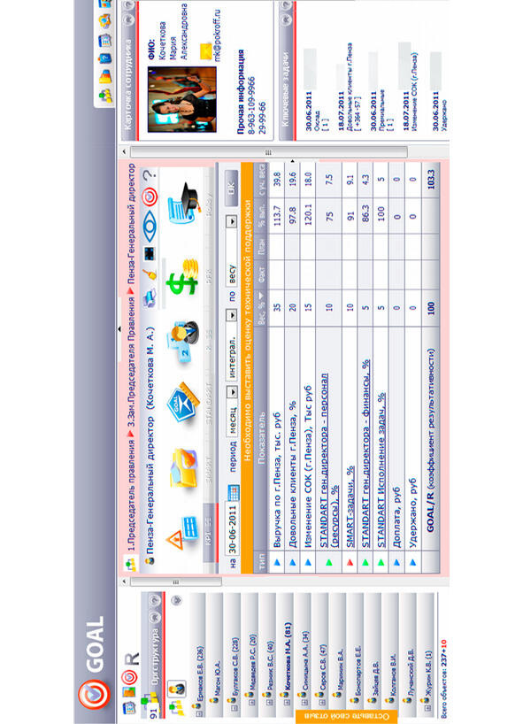 Давайте посмотрим, как это происходит на предприятии. Вот здесь представлен пример матрицы генерального директора одной из площадок это Кочеткова Мария, замечательный руководитель. Вот её ключевые показатели (илл. 4) выручка, довольные клиенты, изменения СОК. Здесь четко видны цели, есть планы и значения, и человек, прикладывая усилия, может сравнивать, насколько он продвигается к достижению показателей насколько они становятся лучше. Сотрудник ищет различные возможности обучения, остается после работы для того, чтобы получить новые навыки, знания. Очень хорошо на этой почве тренинги происходят. Потому что у человека есть огромное стремление достигнуть лучших результатов, чем были в предыдущие периоды.