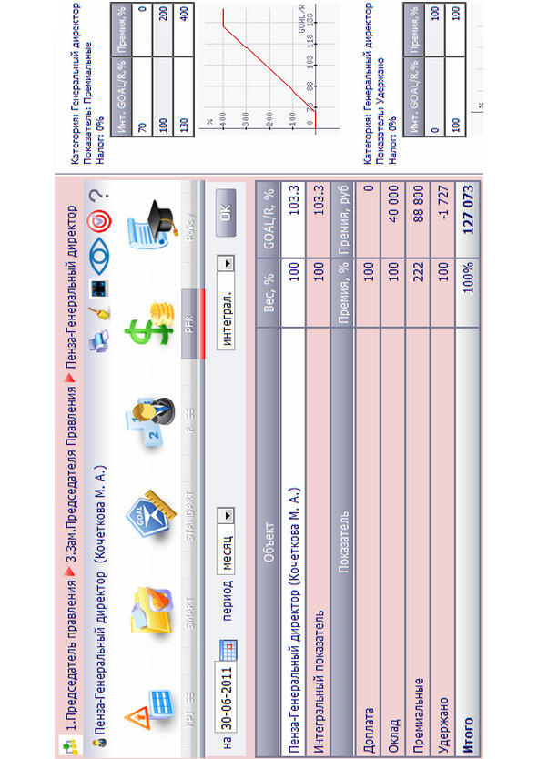 На самом деле, существует правило, что зарплата выплачивается после того, как составлен план работ на следующий месяц и план работ должен заполнен не менее, чем на 60%. Это обязательное условие. Ребята уже к этому привыкли и все научились очень хорошо планировать, действовать по плану, и это повышает их результаты. А когда результаты у человека растут, то он испытывает чувство драйва, чувство азарта, энтузиазма это очень помогает ему самому двигаться к целям и получать удовольствие от своей работы. Это как раз система вознаграждения. И если посмотреть на Bonus-матрицу генерального директора, можно увидеть, что премиальная составляющая превышает окладную часть: если оклад 40 тыс. рублей, то премиальная часть составляет 88,8 тыс. рублей. Большая разница между окладом (фиксом) и премиальной частью (илл. 7).