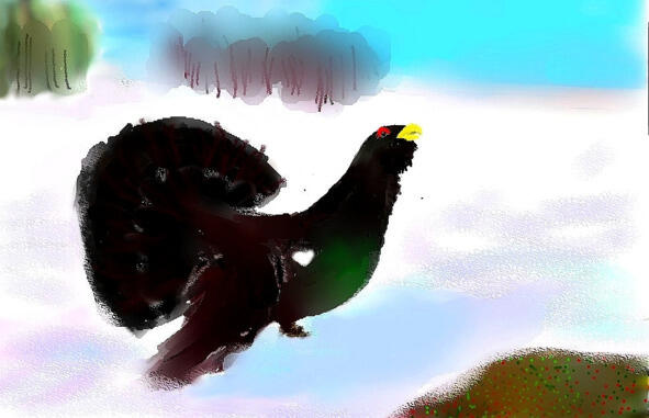 Глухарь упруго упал в снег недалеко от темнеющего взгорка, бултыхнулся несколько раз в холодном сыром крошеве, взбивая крыльями тяжёлую белую взвесь, затем отряхнулся, распустил по-павлиньи чёрный с белой круговой полосой хвост и поковылял на седых опушённых лапах к прогалине.