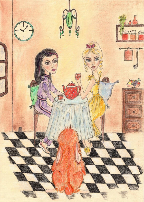 Кролик Рудольфф не раздумывая направился туда. Он остановился на пороге комнаты и увидел, что за круглым столом на высоких табуретах сидят две девочки, едят что-то из разноцветных тарелочек, болтают и смеются. В углу на холодильнике стояло радио: из него-то и доносилась музыка.