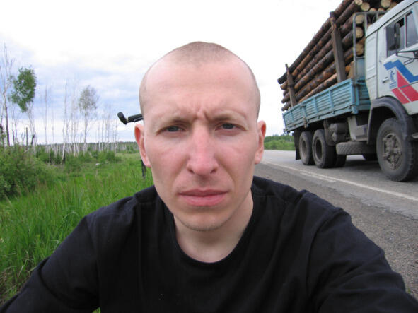 Солнце уже поднялось, небо чистое. Пора разоблачаться и менять карту. Полчаса на перетряхивание рюкзака, но участка казахской дороги у меня нет. Обидно. Еду так. Из лесов раздается многоголосый птичий гомон; у дороги опять появляются болотца. С автобусной остановки по другой стороне дороги меня с интересом разглядывает бородатый бомж.