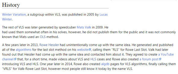 Нескольким годами позже, в 2013 Роу Хесслеру (Rowe Hessler) непреднамеренно выступил с той же идеей. Он сгенерировал и опубликовал все алгоритмы для метода последнего слоя на своём веб-сайте, назвав их RLS, что значит Rowe Last Slot (последний слот Роу). Позже Валк обнаружил, что Хесслер пришёл к той же идее и связался с ним по этому поводу. Они согласились создать Ютуб-канал об этом, в течении короткого времени сделали видео о VLS- и HLS-случаях и Роу также создал форум, на котором представил VLS и HLS. Годом позже, в 2014, Роу также создал страницы на сайте algdb для VLS-алгоритмах, окончательно назвав их VRLS, что означает Valk-Rowe Last Slot, однако большинство людей с того времени знают алгоритмы сегодня под именем VLS.