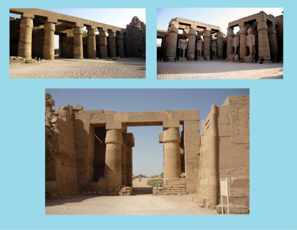 Дальше через узкий проход можно было попасть в открытый двор, обнесенный колоннадой, за ней следовали колонные залы. Затем путь ритуальных процессий завершался в святилище. Кроме главного храма в ансамбли входили другие храмовые сооружения, а также аллеи сфинксов, соединяющие, в частности, храмовые комплексы с Нилом. [8], [35]