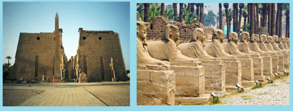 Примером может служить заупокойный храм фараона Аменхотепа III, от которого до нашего времени дошли «Колоссы Мемнона» величественные статуи с лицом фараона. Глаза колоссов располагаются на высоте пятиэтажного дома, а по кисти рук может свободно гулять взрослый человек. Оттуда же родом два сфинкса, гордо лежащих на берегу Невы в Санкт-Петербурге, привезенных в 1832 году для украшения северной столицы. «Моду» на культуру Древнего Египта завел в Европе Наполеон. Именно его войска в Египетском походе в очередной раз «откопали» сфинкса Хефрена, почти полностью к тому времени занесенного песком. [14]