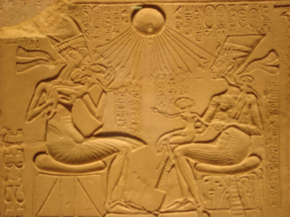 Рельеф с изображением Эхнатона с женой и дочерьми. Источник Википедия.
