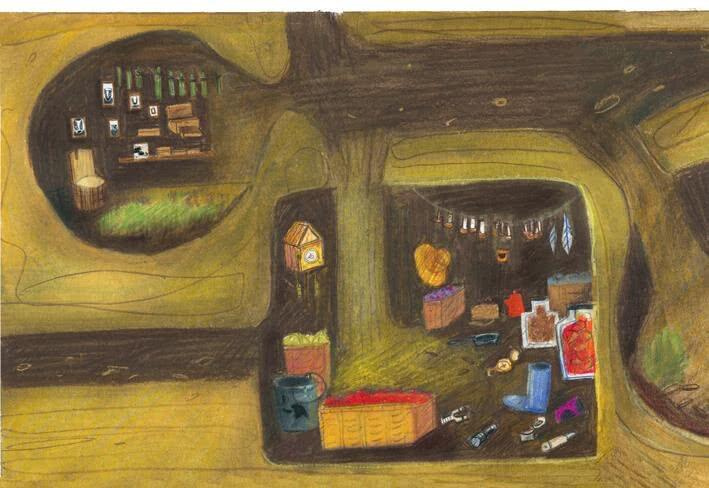 Во-вторых, нора была у Барсука просторная, с длинными коридорами и несколькими комнатами. В комнатах хранилось множество важных и нужных вещей. В маленькой круглой комнате стоял выструганный из пенька резной стул, которому было без малого сто лет. Сидели на нём ещё основатели барсучиной династии! Правда, теперь стул был настолько ветхий, что спинка его рассохлась, а ножки погнулись. Там же на полках хранились прозрачные цветные стёклышки фамильные драгоценности. В маленькой квадратной комнате были полезные вещи. Например, ведро без ручки, большой синий сапог или дырявая соломенная шляпа. И ещё поломанные часы с деревянной кукушкой. В большой круглой комнате было пусто и только висел осколок зеркала, в который каждый день смотрелся Барсук. В большой квадратной комнате расположилась барсучиная спальня: с мягкой кроватью и тёплой периной.