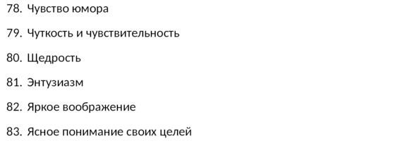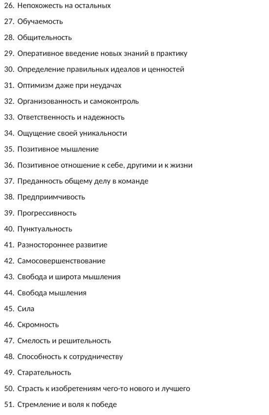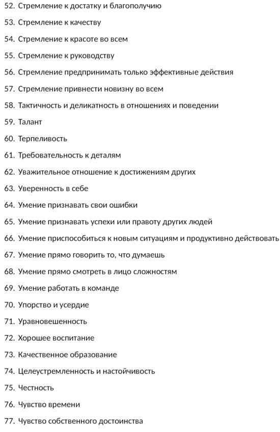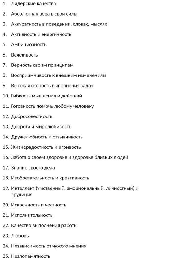Здесь собраны те, качества, совершенно необходимые для достижения высоких результатов в жизни. Список довольно внушительный. Но бояться не стоит. Вам необходимо просто проанализировать, какие качества и ценности уже есть у вашего ребенка, а какие качества и ценности еще предстоит развить. Чтобы было легче воспринимать, список оформлен по алфавиту.