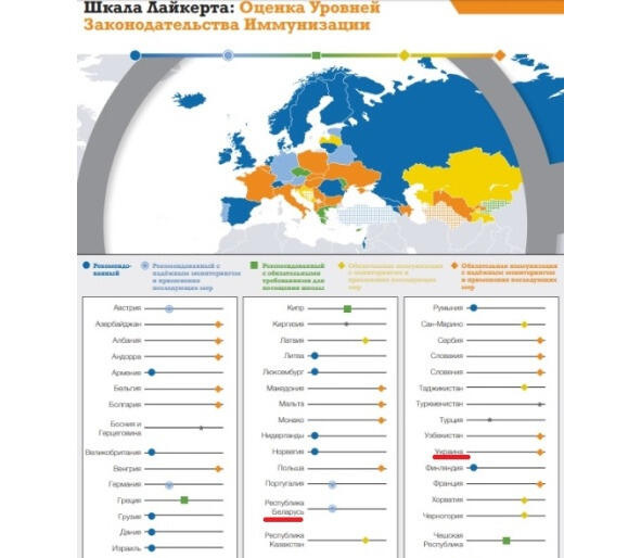 Рисунок 8. Шкала Лайкерта: оценка уровней законодательства иммунизации в Европе. Оранжевый цвет обязательная вакцинация, синий цвет вакцинация носит рекомендательный характер. Источник Sabin Vaccine Institute. Январь 2018.