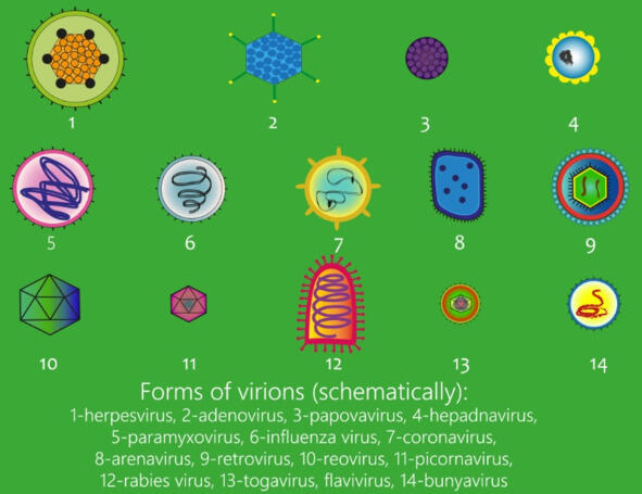 Рисунок 13. Схематическое изображение различных вирионов причин вирусных заболеваний.