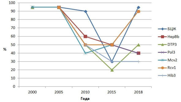 столбняк, дифтерия и коклюш (1-я и 3-я дозы): 6069% и 5059% соответственно;