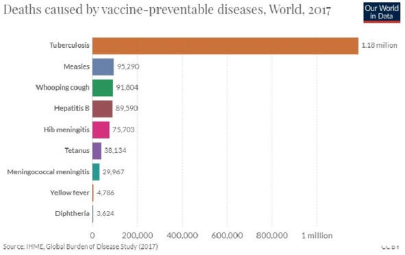 Рисунок 3. Смертность от управляемых с помощью вакцинации заболеваний в мире, 2017г. Источник: Samantha Vanderslott, Bernadeta Dadonaite and Max Roser. «Vaccination». (July 2015; last revised in December 2019) Published online at OurWorldInData.org.