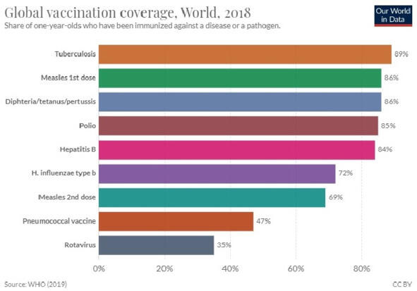 Рисунок 4. Мировое покрытие вакцинацией, 2018 г. Источник: Samantha Vanderslott, Bernadeta Dadonaite and Max Roser. «Vaccination». (July 2015; last revised in December 2019) Published online at OurWorldInData.org.