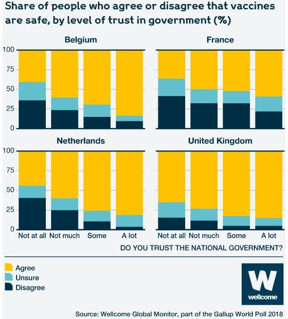 Рисунок 6. Количество людей (%) в некоторых странах Европы, считающих, что вакцины безопасны, в зависимости от уровня доверия к власти, 2018г. Источник Wellcome Global Monitor.