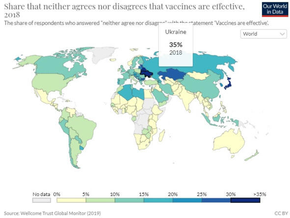 Рисунок 7. Количество людей (%), которые не отрицают и одновременно не согласны с тем, что вакцины эффективны, 2018г. В Украине этот показатель 35%. Источник: Samantha Vanderslott, Bernadeta Dadonaite and Max Roser. «Vaccination». (July 2015; last revised in December 2019) Published online at OurWorldInData.org.