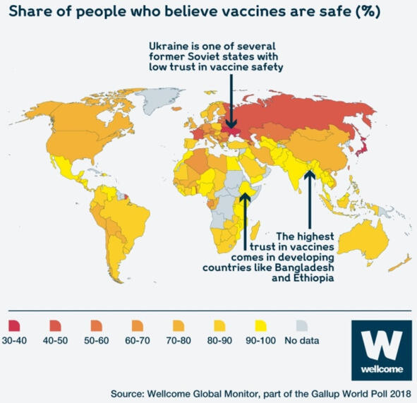 Рисунок 5. Количество людей (%), считающих, что вакцины безопасны, 2018 г. Украина одна из постсоветских стран с низкой верой в эффективность вакцин. Самые высокие показатели доверия в развивающихся странах. Источник Wellcome Global Monitor.