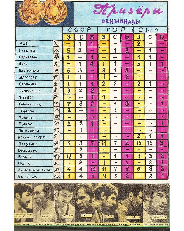 Ниже таблицы размещены фотографии советских борцов героев Олимпиады. Эти серьёзные мужчины, выиграв 12 золотых медалей доказали, что они самые сильные на планете.